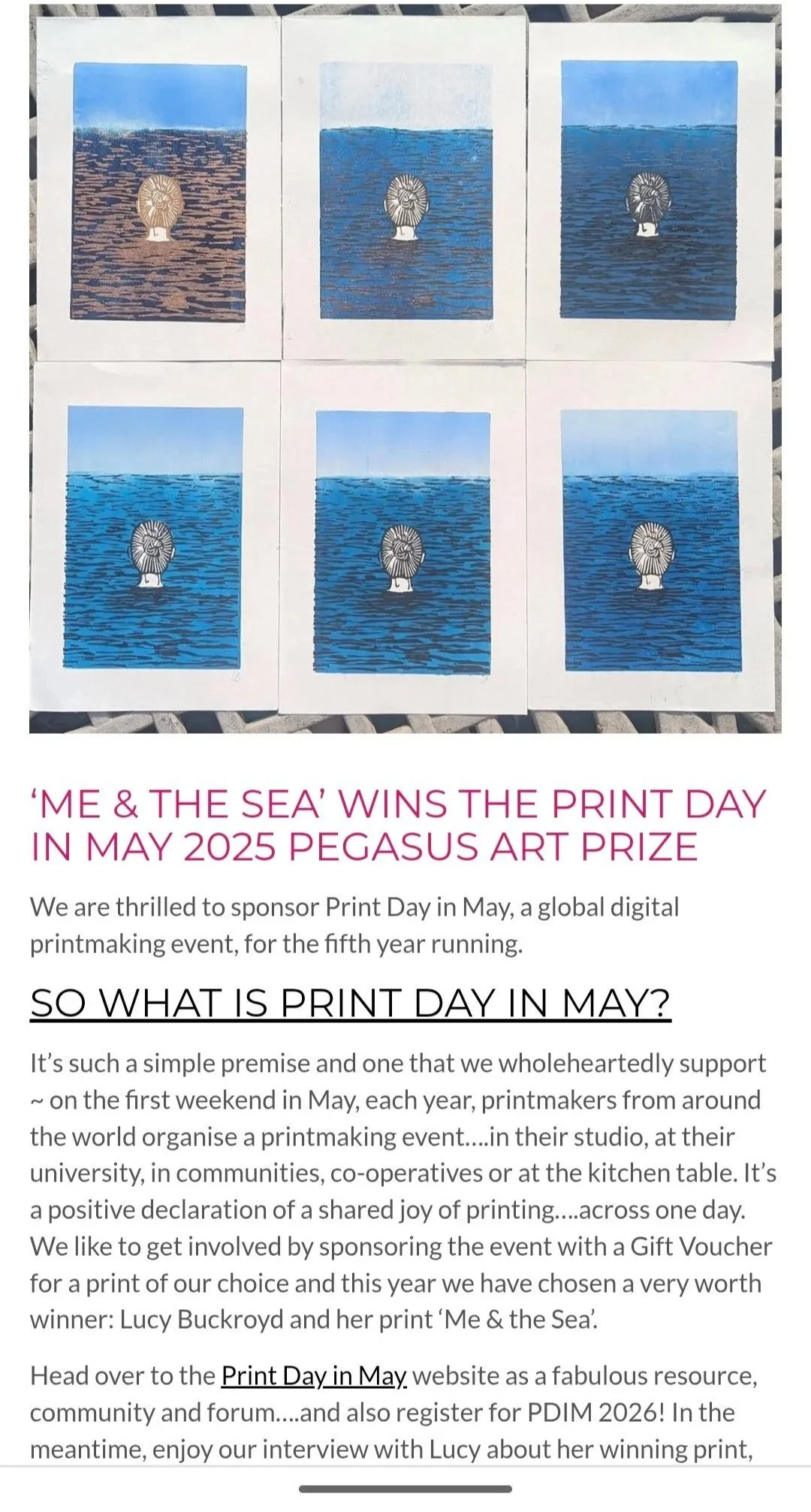 I did an interview with the Pegasus Art Blog about my print ‘Me and the Sea’ and answered some questions about my art practice. I’m very grateful to them for the prize and for featuring me on their fantastic blog.